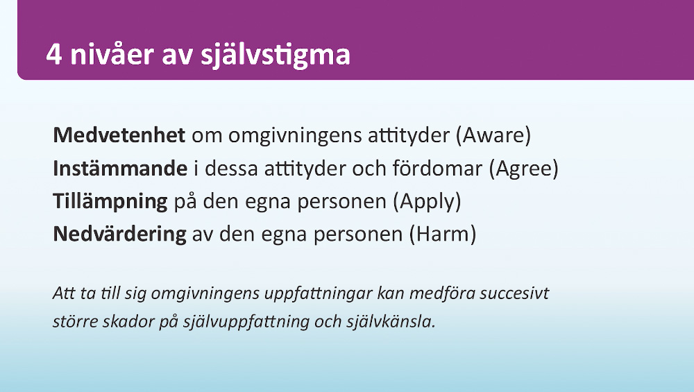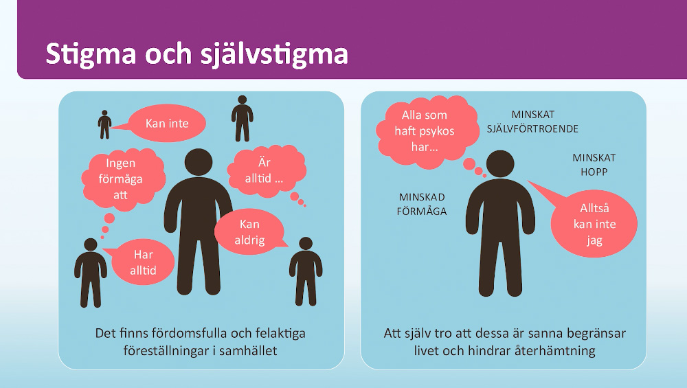 Ett exempel är att en person med schizofreni inte vill bli "stämplad" som schizofren på grund av de negativa associationerna kring sjukdomen. Den rädslan för att bli dömd av samhället gör att många undviker att söka vård eller professionellt stöd, vilket leder till ökat lidande och förvärrade symtom. Utan rätt behandling blir det svårt att hantera sjukdomen, vilket i sin tur kan påverka utbildning, arbetsliv och relationer.